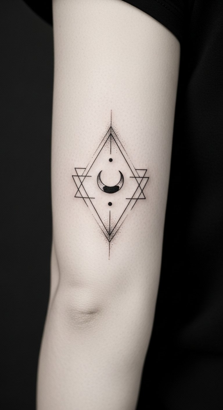 A tiny crescent moon with accompanying dot and subtle triangular negative-space accents symbolizes balance between introspection and outward curiosity; placed directly over the elbow crease it aligns motion with meaning, so bending and straightening the arm gently animates the piece.