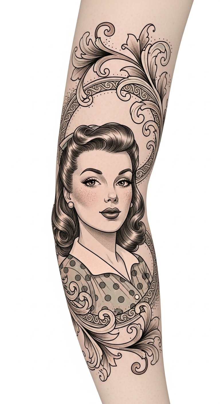 Retro elegance emerges through intricate designs, like classic pin-up girls or vintage floral patterns, wrapping around your elbow. These tattoos capture a bygone era’s spirit, inviting you to express your individuality.