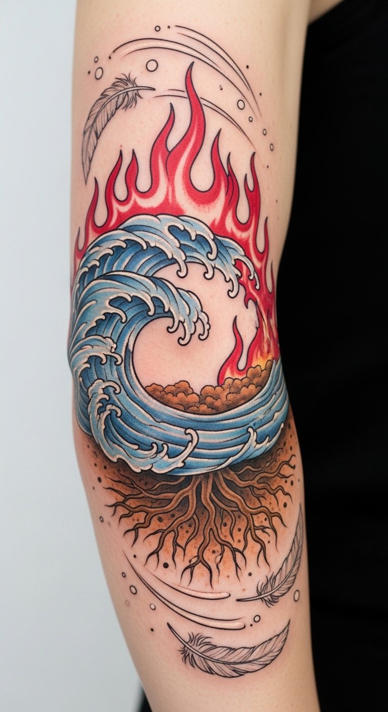 This placement emphasizes the joint’s motion—waves and wind flowing with movement, flames and roots anchoring the piece—symbolizing balance between change and stability; emotionally it conveys harmony, passion, grounding, and liberation, best centered on the elbow with extensions along forearm and triceps for continuity.