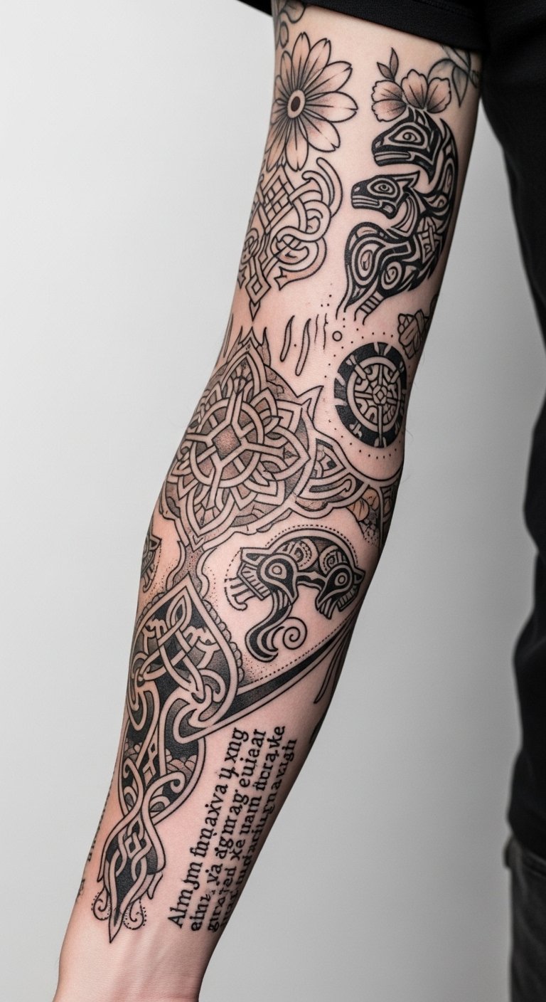 Each piece becomes a canvas, celebrating your individuality while weaving narratives that resonate deeply within your soul. This design emphasizes the elbow as a focal point—negative space and flowing knotwork move with the joint to evoke resilience and continuity; animals and floral elements symbolize guardianship and growth, while the inner-script honors personal lineage, creating an emotional blend of pride and introspective tribute best placed wrapping the forearm into the elbow for visibility and movement.