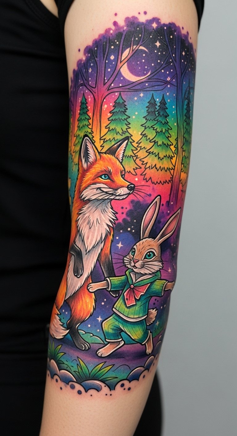 These elbow tattoos blend symbolism and emotion by pairing playful animals—fox for cleverness and rabbit for joy and agility—with a dreamlike landscape that evokes personal freedom and creativity.