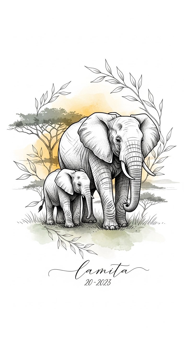 The elephant mother and calf symbolize familial bonds, strength, and guardianship; the acacia branches and sun-dappled washes evoke habitat and the fragile balance of ecosystems, while the gentle watercolor hints convey warmth and memory.