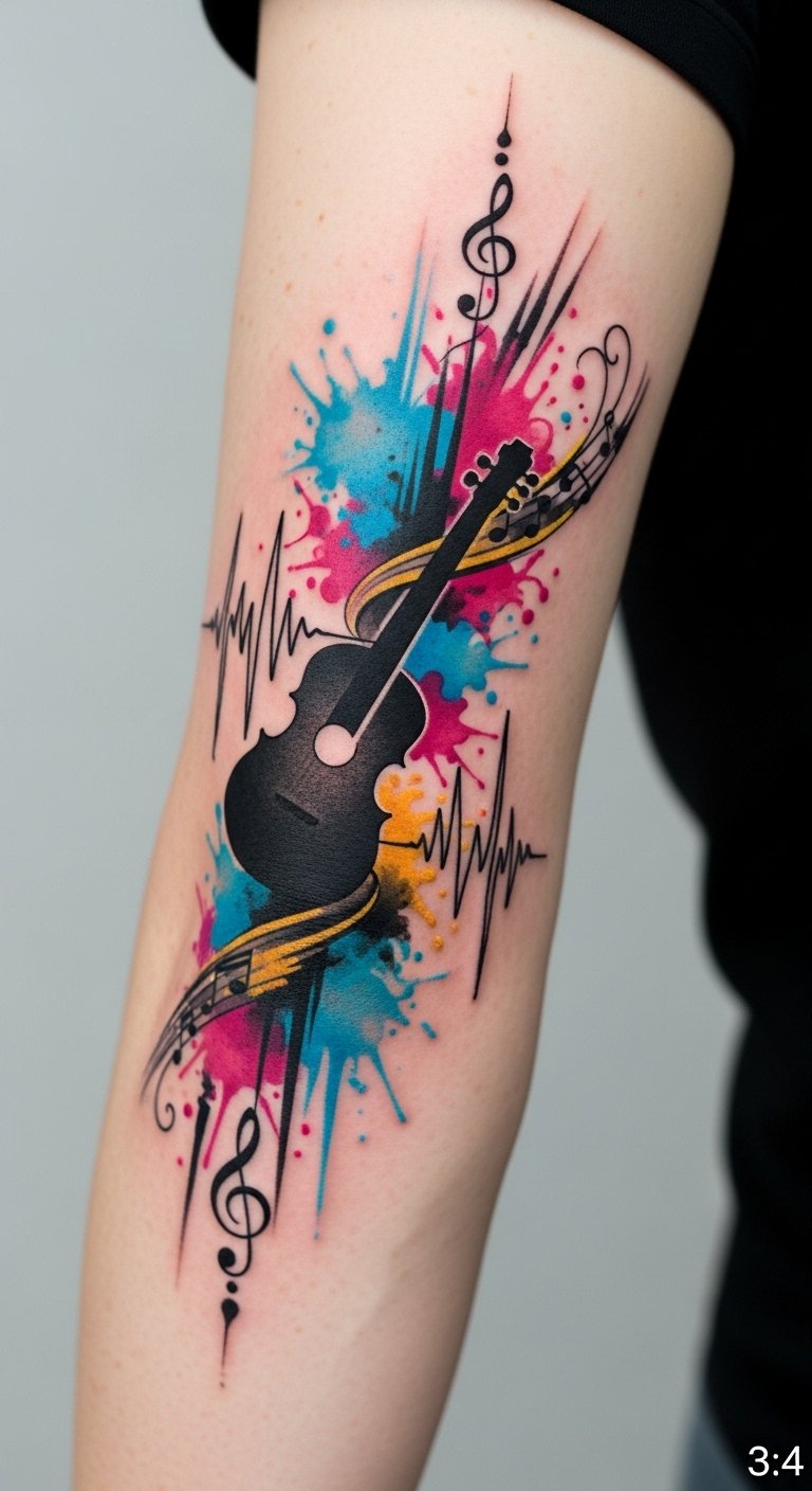 Your tattoo becomes a canvas, telling a story of freedom, passion, and the harmonious blend of sound and vision. The elbow placement emphasizes movement and bend, so the flowing notes and brushstrokes wrap naturally around the joint, symbolizing the union of motion and melody; vibrant colors evoke emotional intensity while the instrument silhouette grounds the piece in personal identity.
