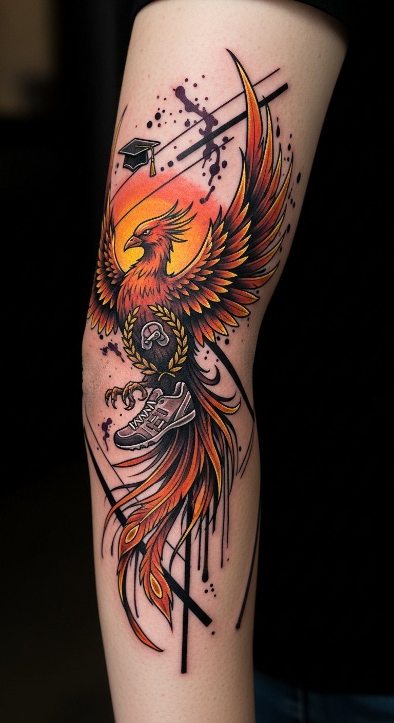The phoenix symbolizes rebirth and perseverance, the street-art splashes connect to urban identity and boldness, and the embedded icons make each victory literal and personal; warm tones evoke triumph and hope, gold highlights mark value and accomplishment, and the elbow placement uses the joint’s natural movement to animate the rising motion—ideal for someone who wants a visible, meaningful emblem of progress.