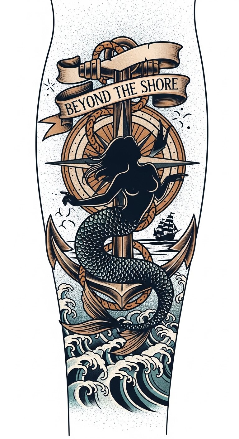 This design symbolizes steadfastness (anchor), guidance (compass), and alluring mystery (mermaid), evoking yearning, courage, and nostalgia; emotionally resonant for those who seek horizons.