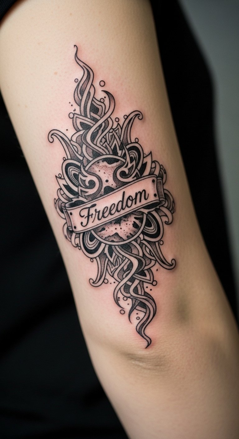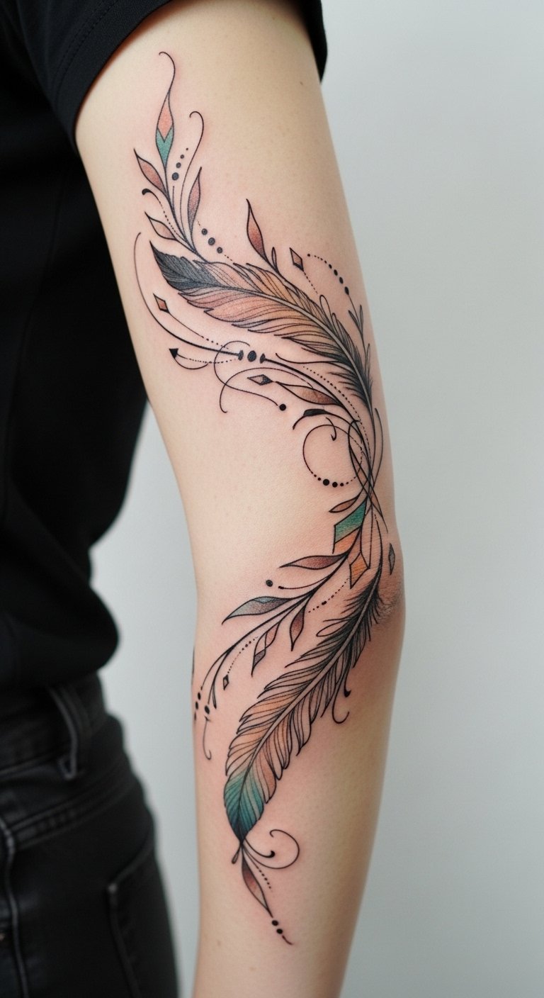 The design symbolizes resilience and freedom—vines represent growth and connection, the feather hints at lightness and personal aspiration, and geometric accents ground the composition with intention; placed to follow the elbow’s natural fold, the piece moves with the arm so that curves and lines align during flexion and extension, creating a living, emotive statement that feels intimate and protective while showcasing fine detail where the skin allows.