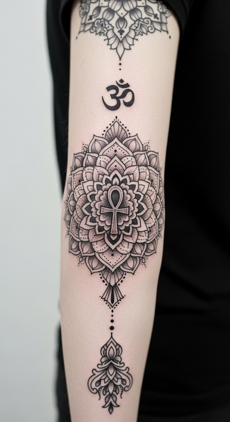Whether it’s a mandala, ankh, or Om, these tattoos invite others to glimpse your inner self, celebrating your freedom and individuality. This placement centers symbolism on a joint that moves and bends—expressing fluidity between inner and outer life—while the mandala brings balance, the ankh signifies life and continuity, and the Om anchors spiritual resonance.