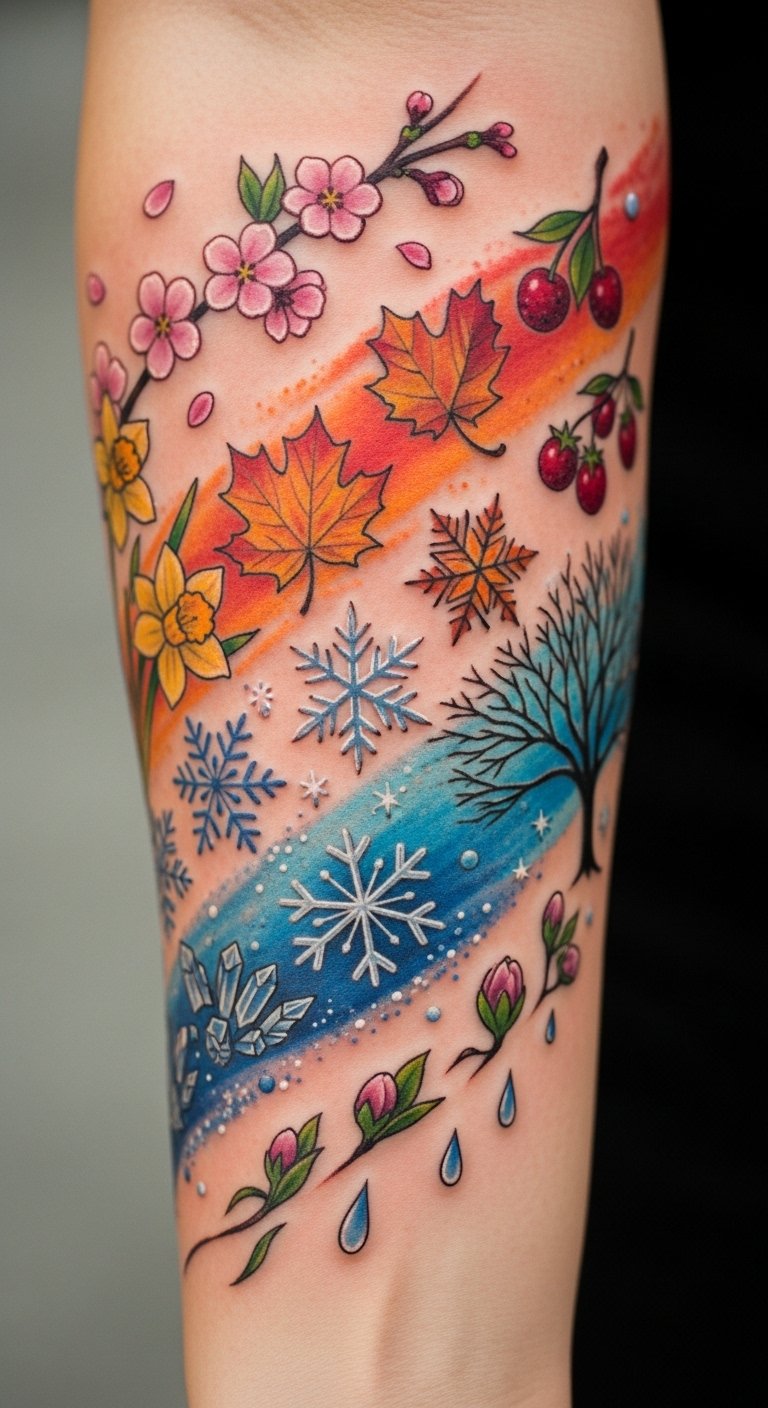 A flowing vertical sleeve that transitions through the quoted seasonal imagery—delicate cherry blossoms unfurling at the shoulder into bright summer blooms, then turning into warm-toned maple leaves mid-arm, and finally scattering into fine, geometric snowflakes near the wrist—evokes cycles of growth, change, and rest. The design carries emotional resonance as a reminder to honor beginnings, passions, endings, and quiet renewal; it suits forearm or calf placement for visibility and movement, or a side-rib piece for a more intimate, personal connection.
