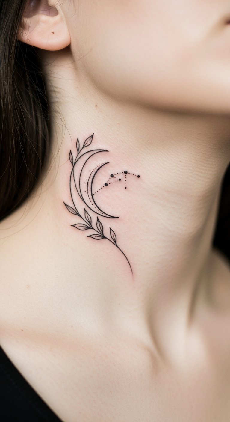 The crescent moon and tiny constellation evoke quiet introspection and guidance, the negative-space leaves suggest growth and renewal, and the placement below the jawline keeps the piece intimate—visible in conversation but easily concealed—conveying confidence through restraint.