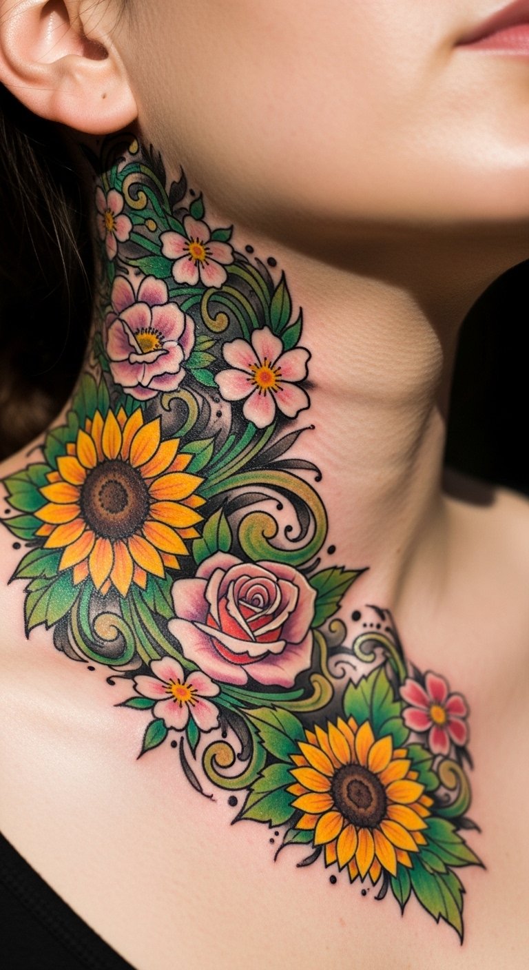 The design centers a cascade of mixed blooms flowing along the side and nape of the neck: soft roses, energetic sunflowers, and sprigs of wildflowers and leaves, inked with delicate linework and subtle color washes to balance boldness and elegance.