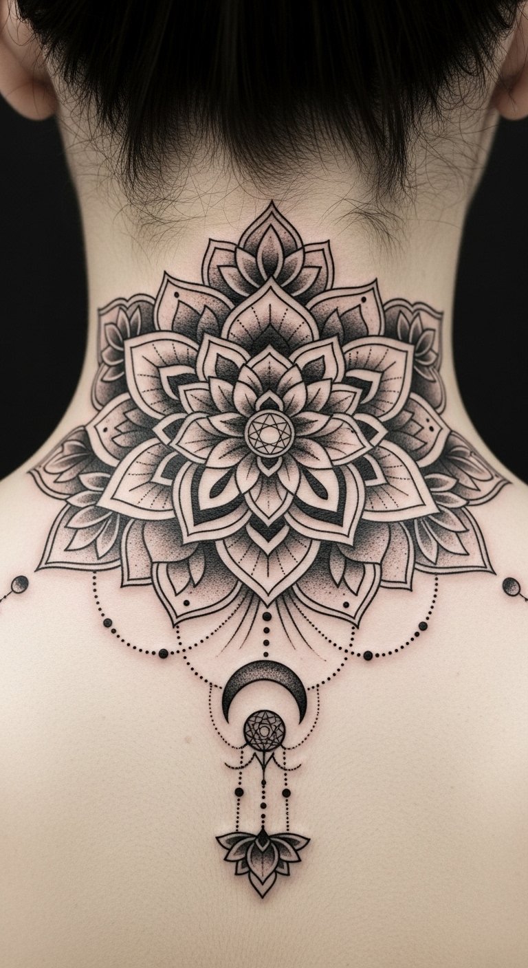 By adorning your neck with these spiritual patterns, you embrace their profound spiritual significance, allowing your body art to reflect your journey toward personal freedom and inner peace. This placement at the nape and along the jawline evokes protection and openness—symbolically guarding the center of communication and intuition—while the layered petals and sacred geometry invite calm, balance, and contemplative emotion.