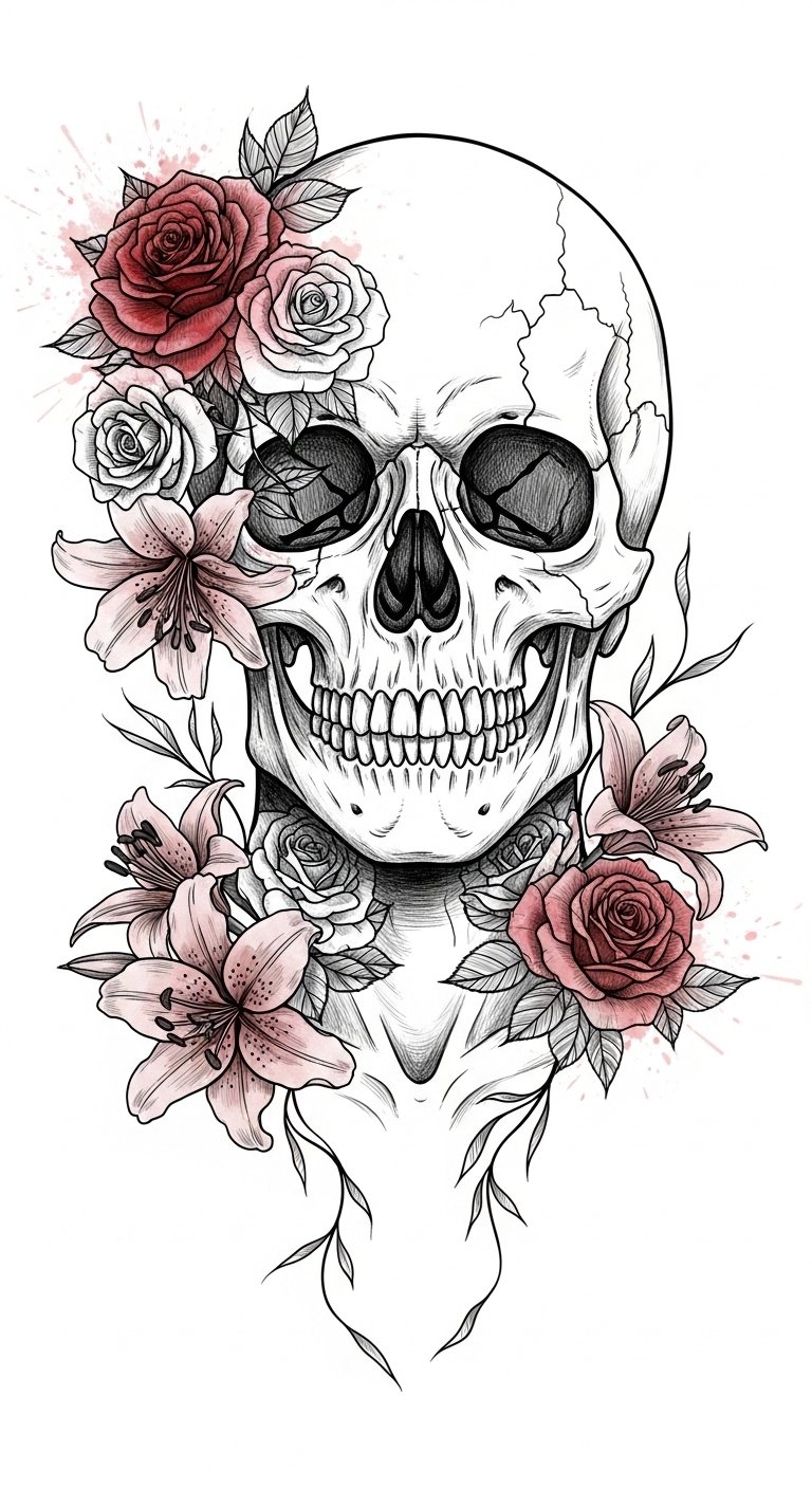 The design places the skull front and center for a bold statement of mortality, with flowers softening the image and wrapping toward the collarbones to suggest growth outward; emotionally it balances somber acceptance and hopeful resilience, and the neck placement ensures visibility and intimate symbolism for the wearer.