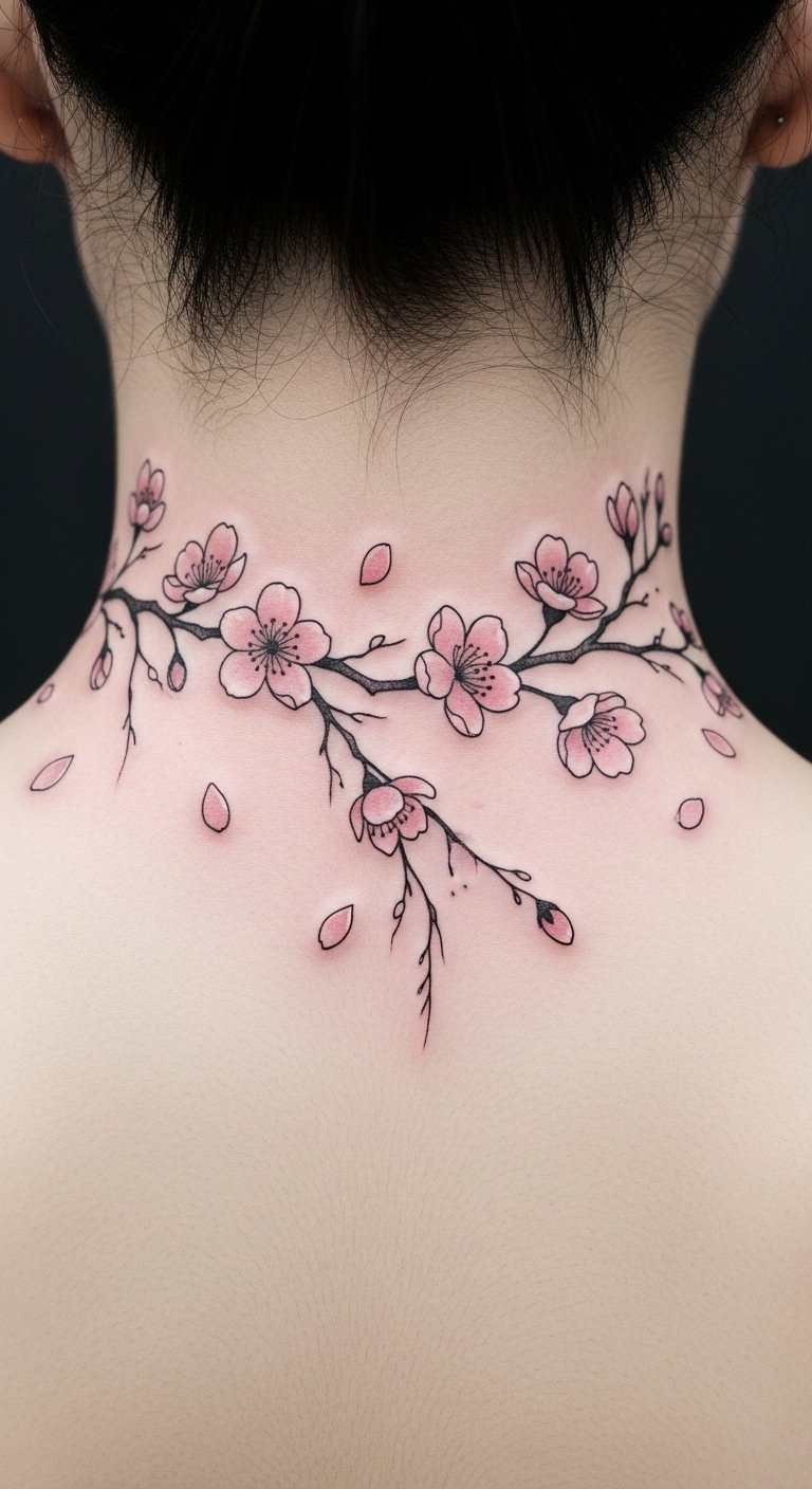 Cherry Blossom Neck Tattoos: Transience and Beauty