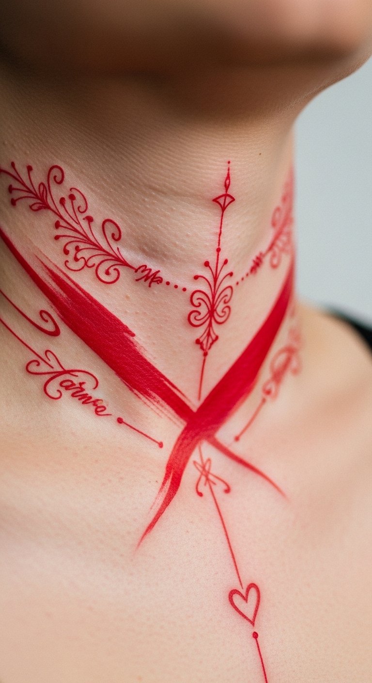 Red ink symbolism speaks of love, courage, and strength, making your neck a canvas for self-expression. Each bold color stroke resonates with a fierce spirit, inviting you to embrace your uniqueness and wear your heart proudly.