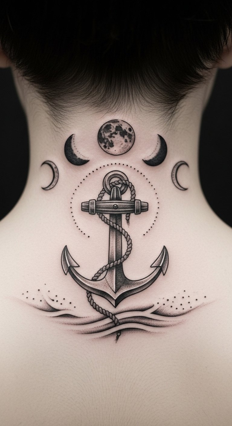Embracing this stability symbolism, your anchor tattoo becomes a declaration of resilience, a powerful statement that embodies your quest for freedom and unwavering spirit. The placement at the nape reinforces protection and quiet resolve; the moon arc suggests cyclical guidance while the rope and wave details tie the piece to journey and endurance, evoking calm confidence and personal anchoring.