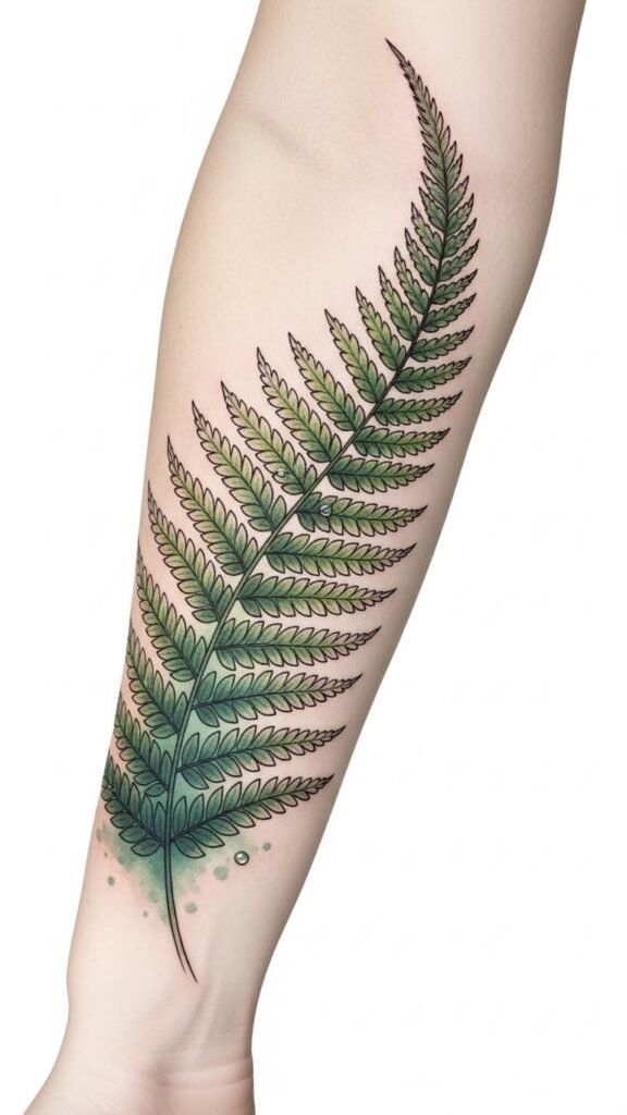 The design symbolizes quiet strength and renewal; emotionally it conveys calm, resilience, and an inward-reaching vitality. Ideal placements are along the forearm, ribcage, or behind the shoulder blade where the frond’s gentle curve follows the body’s natural lines, creating a personal, intimate statement of growth and renewal.