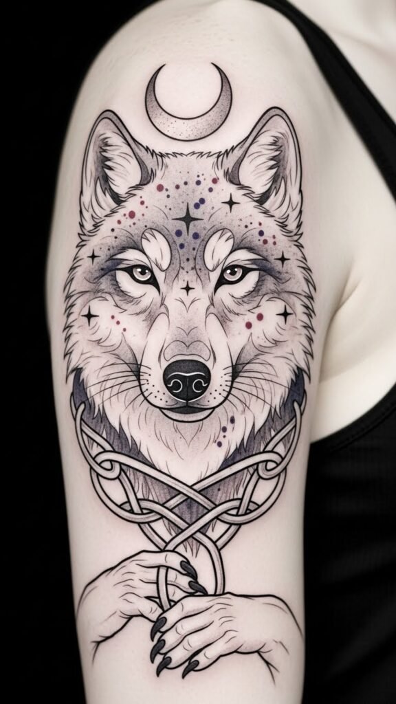 Embracing wolf symbolism in your tattoo can serve as a powerful reminder of your own fierce spirit, loyalty, and the freedom that comes from deep connections. Place the design where it can follow the body’s lines—across the upper back for a protective presence, on the upper arm sleeve for personal visibility, or over the heart for intimate meaning; the grayscale with indigo and crimson accents evokes solemnity, passion, and enduring bonds.
