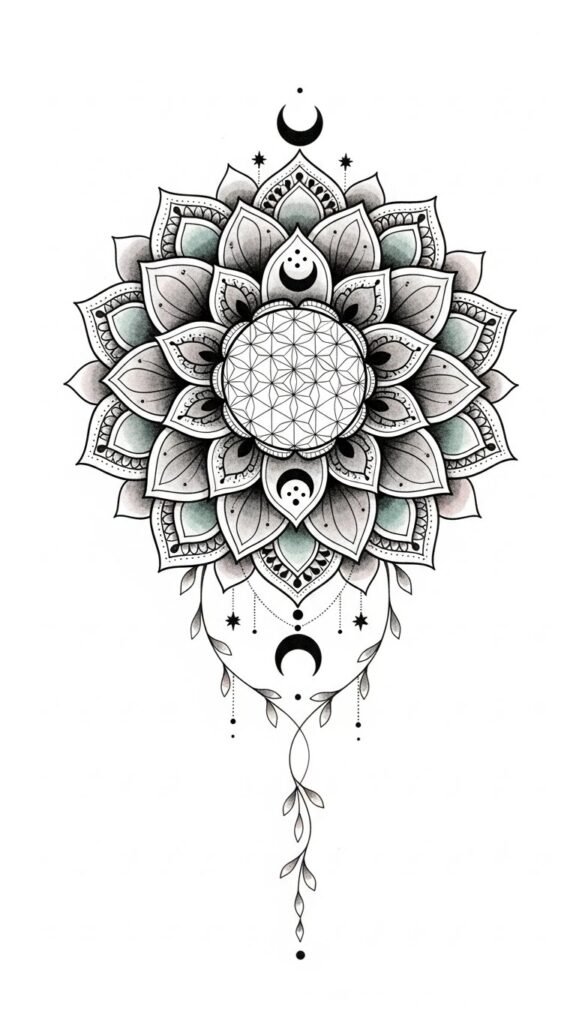 Embrace these enchanting tattoos as a beautiful affirmation to your free-spirited nature. Place the design centered on the outer ankle or wrapping slightly around the ankle bone so the layered petals radiate outward; the fine crescents and stars add a gentle nocturnal feel, while the watercolor hues evoke calm and introspection, making the piece both a visual anchor and a personal reminder of harmony and growth.
