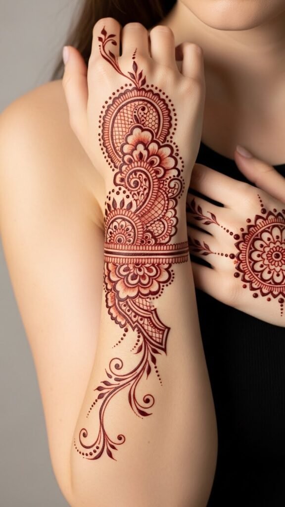 The concept channels tradition and intimacy—floral and paisley motifs signify growth, protection, and celebration; the mandala focal point invites balance and centeredness; tendrils along fingers and wrist evoke connection and continuity.