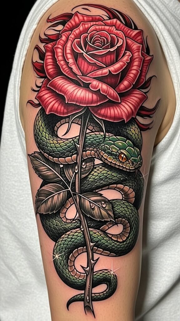 Flowing from the fierce energy of the snake, the passionate rose tattoo captures the essence of love and beauty intertwined with strength.