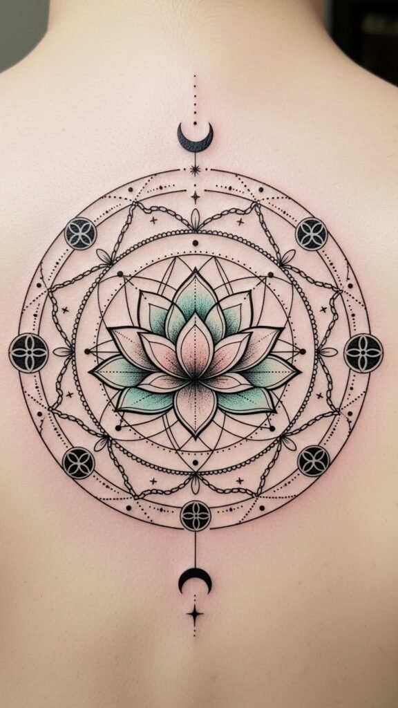 The design layers the lotus and geometric forms to symbolize rebirth and structure, the broken-chain elements and seed-of-life motifs speak to liberation and renewal, and the soft watercolor tones evoke tenderness and hope; ideal placement is centered on the upper back for grounding or over the sternum to feel it close to the heart, allowing the wearer to carry its emotional resonance and remind themselves of ongoing healing.