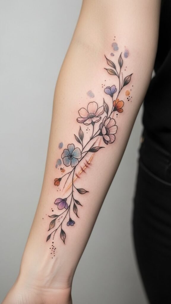 This design uses natural, growing imagery to symbolize renewal and continuity; the wildflowers represent individual moments of triumph and the vine’s path mirrors life’s winding progress. Watercolor tones convey tenderness and emotional depth, while fine line details honor the scar’s history without obscuring it.