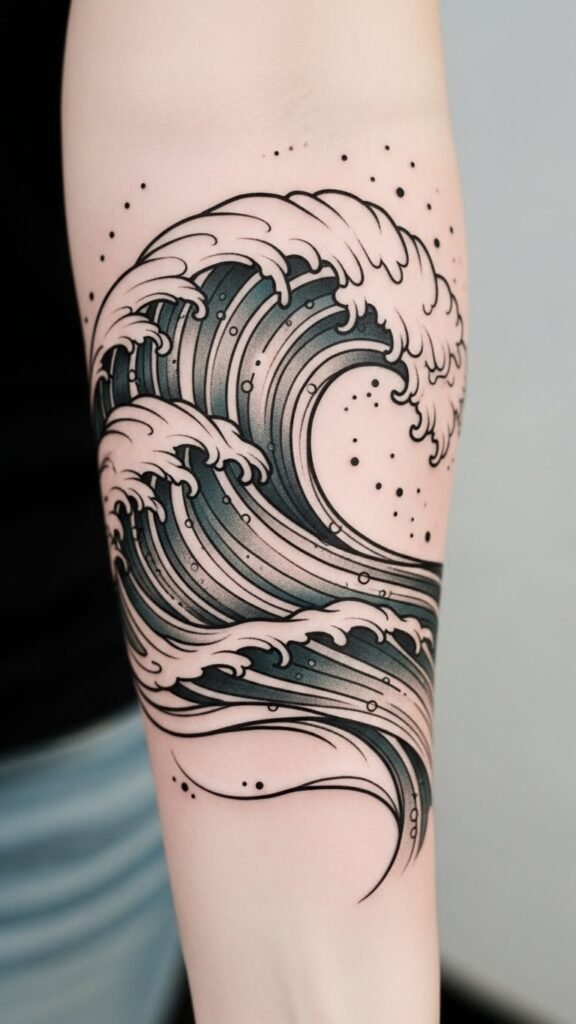 A tattoo featuring ocean waves symbolizes freedom and the dynamic nature of life. Each curve captures wave dynamics, reminding you to flow with challenges and embrace change.