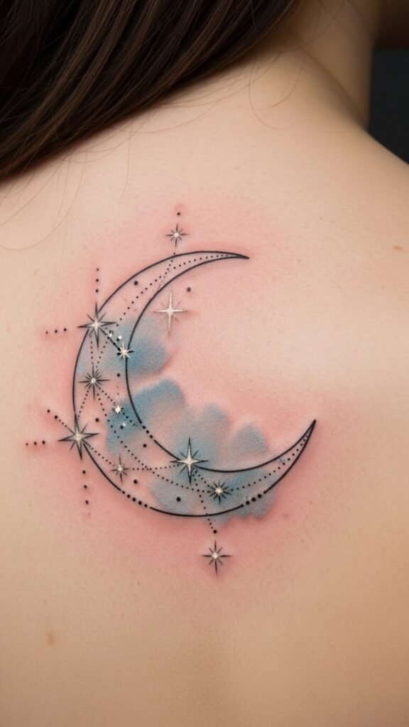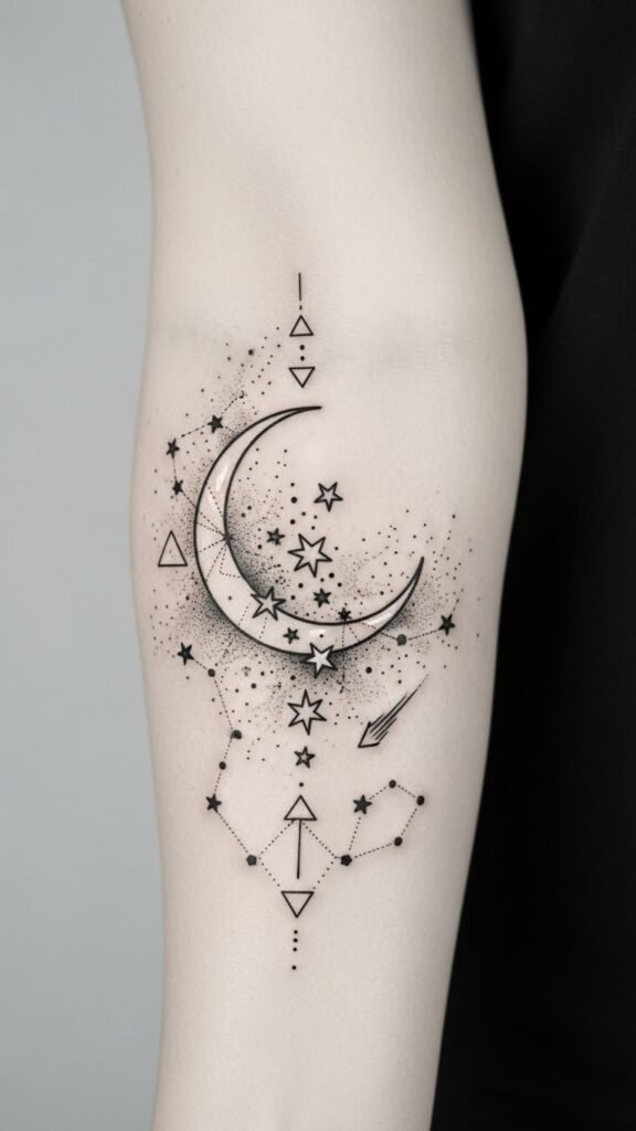 The design symbolizes guidance, hope, and the intimate bond between the wearer and the night sky — the crescent as protection, the stars as personal milestones — conveying quiet wonder and resilience; emotionally subtle and contemplative, it suits inner forearm placement to allow both private reflection and easy display, or scaled smaller for wrist or behind-ear placement for a more discreet, intimate meaning.