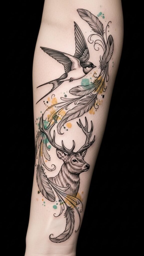 This design blends the swallow (freedom, guidance) and stag (strength, renewal) linked by feathers and vines to evoke balance between instinct and resilience; placed along the outer forearm it follows natural contours to create motion and intimacy, the muted palette lending gentle emotion and timeless wear.