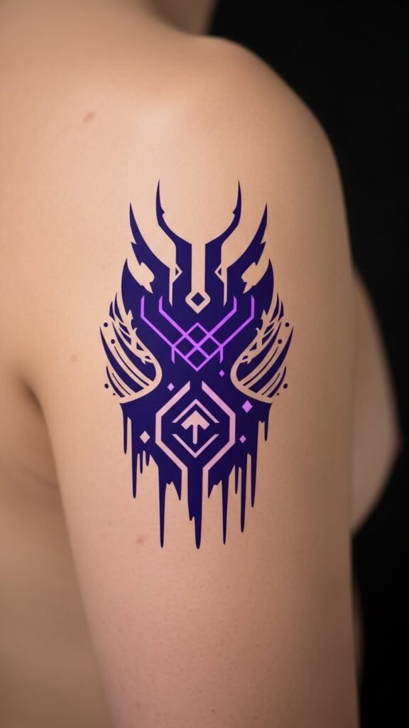 A forearm-to-shoulder sleeve design that layers sleek circuit-line sigils, neon-infused glyphs, and fragmented holographic panels; central piece a stylized sigil resembling an open eye encircled by micro-geometry, with thin luminous filaments extending like synaptic pathways.