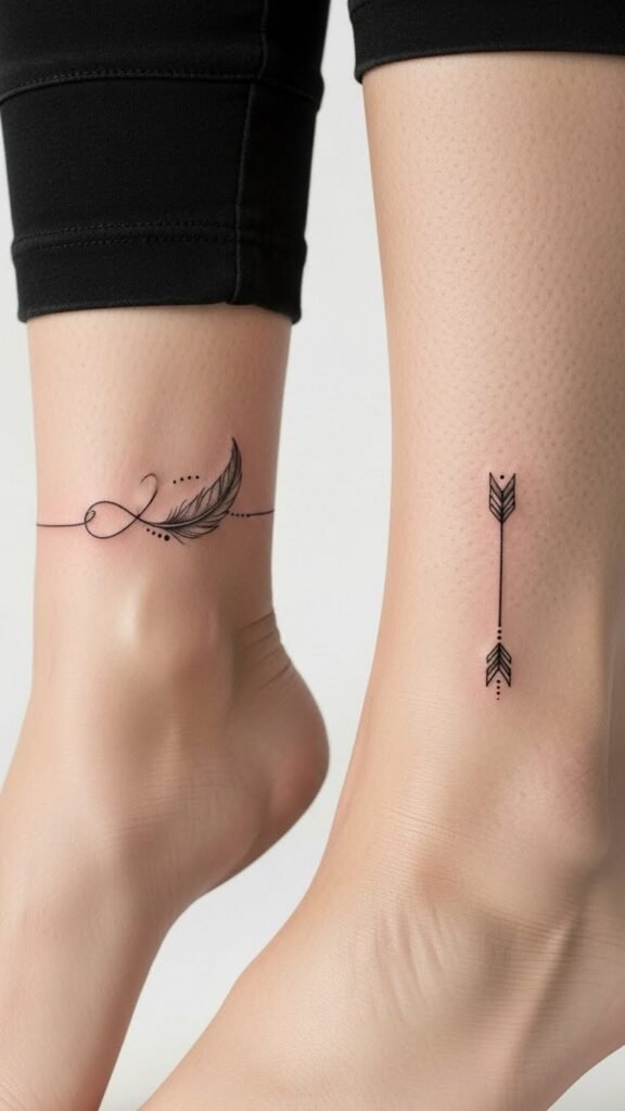 The infinity-to-feather on the wrist symbolizes continuity and gentle resilience, while the matching micro arrow at the ankle represents direction and forward momentum; together they evoke a quiet balance of memory and movement, placed where you can glimpse them often yet keep them intimate.