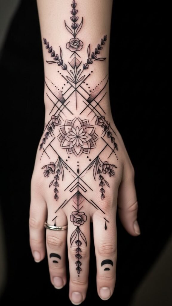 The floral elements symbolize growth, resilience, and personal memories, while the geometric lines represent structure and intention; together they evoke a balance of softness and strength.