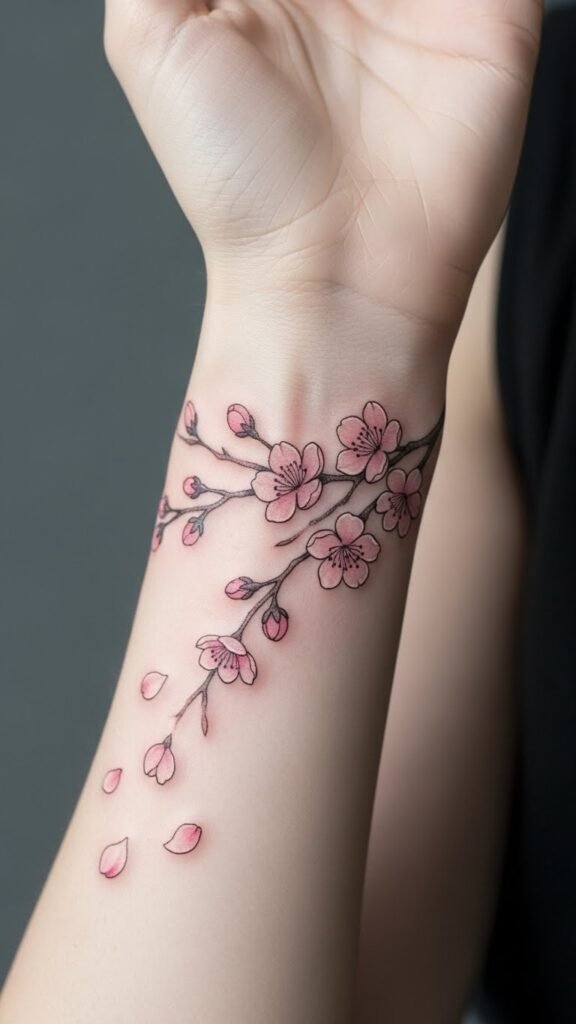 With every glance, you’ll feel empowered to embrace your own journey. The design symbolizes transience and renewal, evoking gentle resilience and mindful acceptance; it suits the inner wrist or along the radial side where movement animates the falling petals, offering an intimate reminder of growth during moments of change.