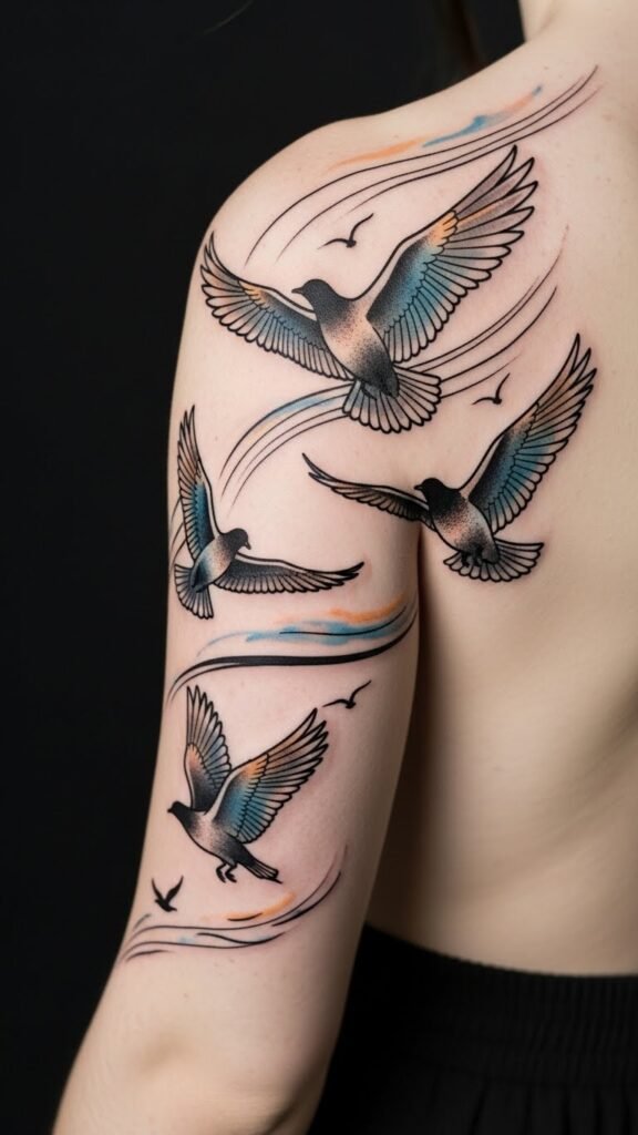 These stunning creatures inspire your self-expression, reminding you that like them, you too can navigate life’s storms and embrace your unique path with grace and strength. The design conveys resilience and liberation—movement across the body suggests growth and progress, the lone divergent bird symbolizes personal choice and individuality, and the watercolor hues add emotional warmth;