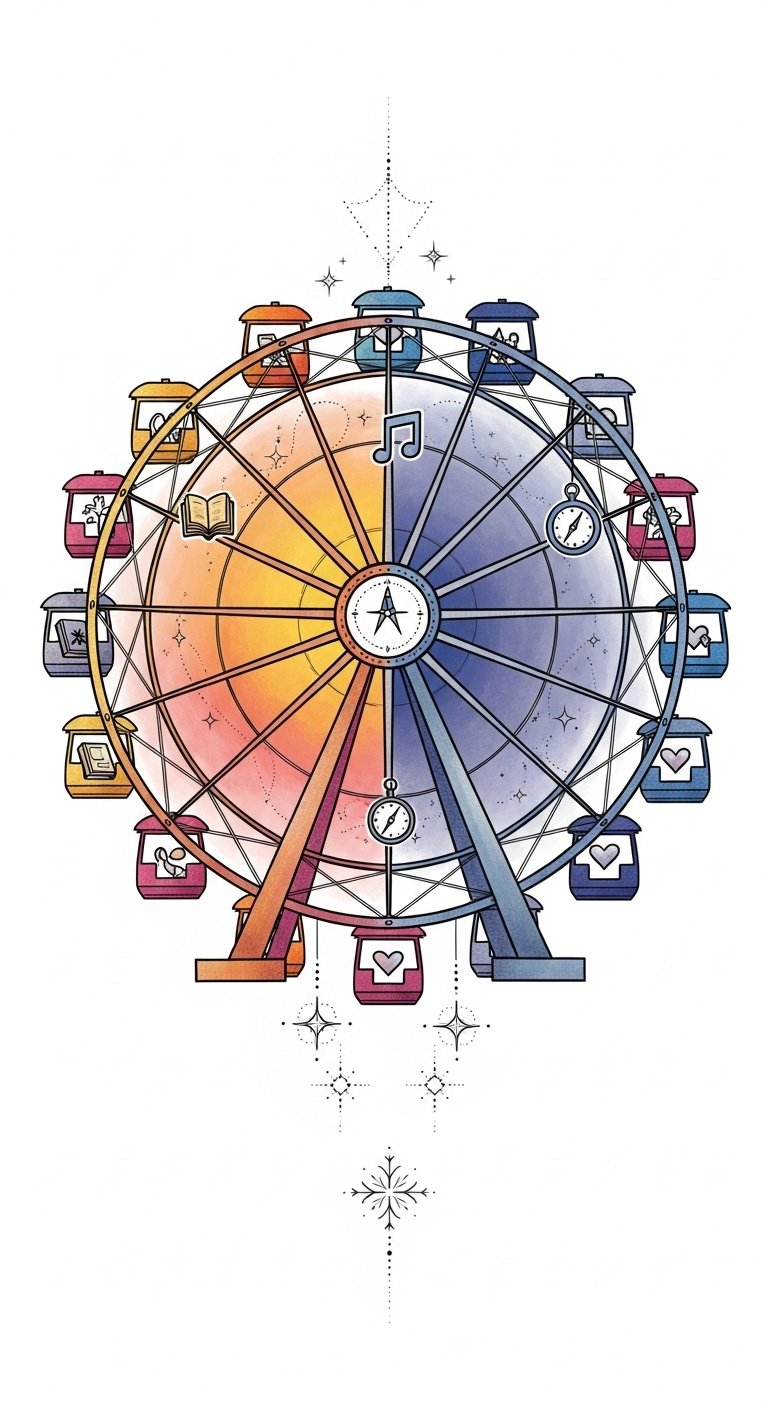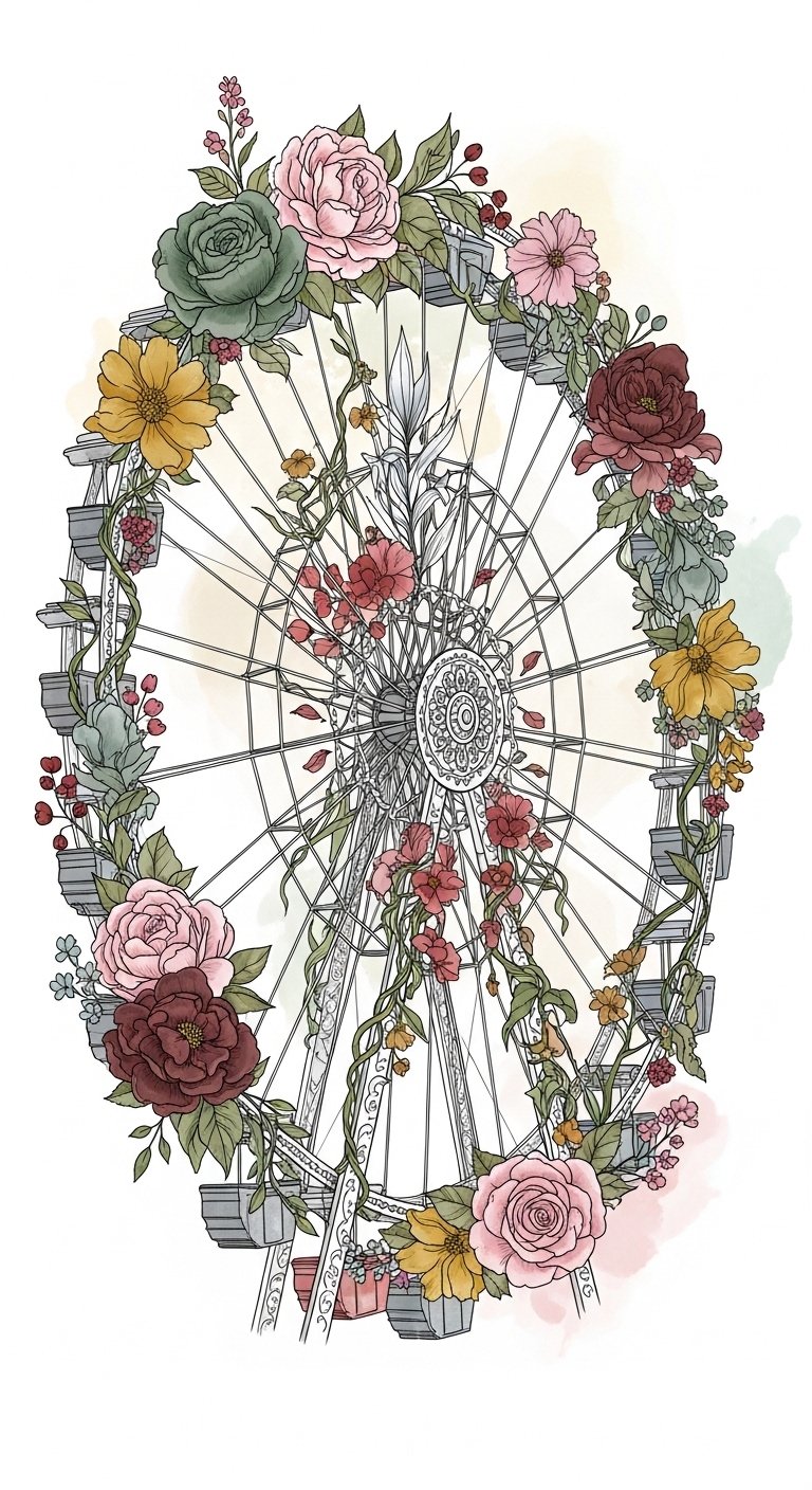 This design symbolizes the cyclical nature of memory and joy, blending the mechanical structure of the Ferris wheel with soft, dreamlike colors to evoke warmth and wistfulness; the lanterns and ticket stubs represent moments and milestones, while the ribbons and confetti suggest celebration and play.