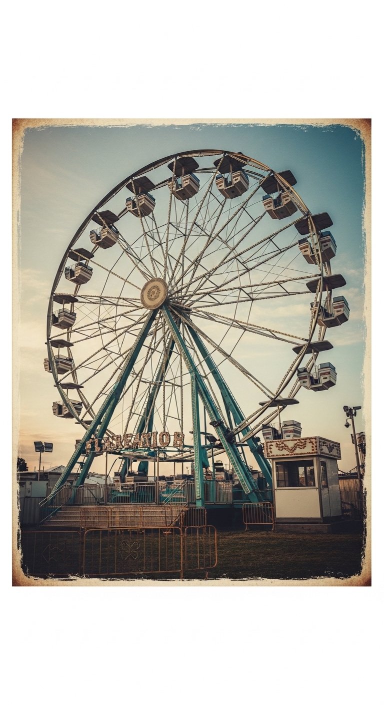 This design uses the original scene to symbolize balance between nostalgia and forward motion: the Ferris wheel represents cycles, joy, and freedom while the warm sunset palette evokes transition, peace, and emotional warmth.