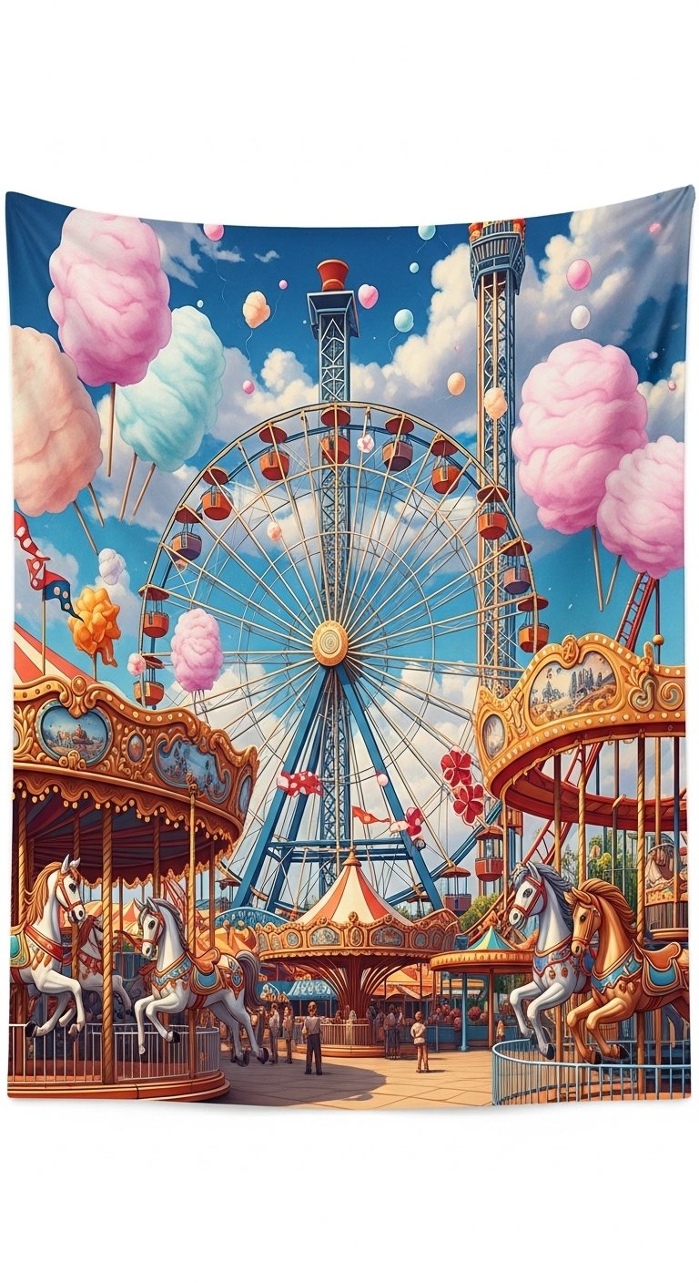 The design combines a detailed Ferris wheel at center, its spokes morphing into ribbons that weave through stylized carousel horses and fluffy cotton candy clouds;