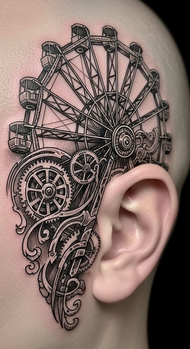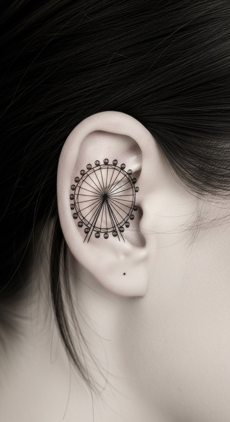 A minimalist Ferris wheel tattoo behind the ear captures the essence of joy in its simplest form.