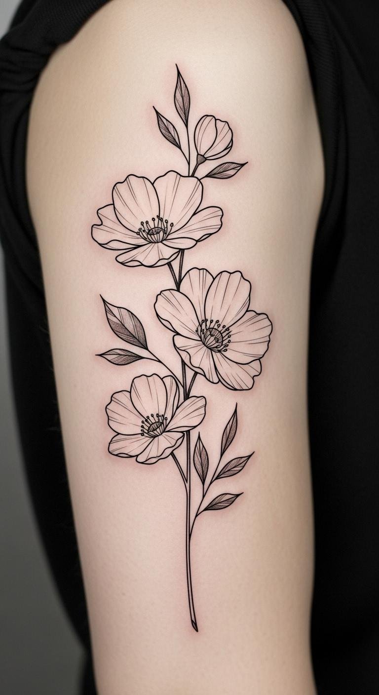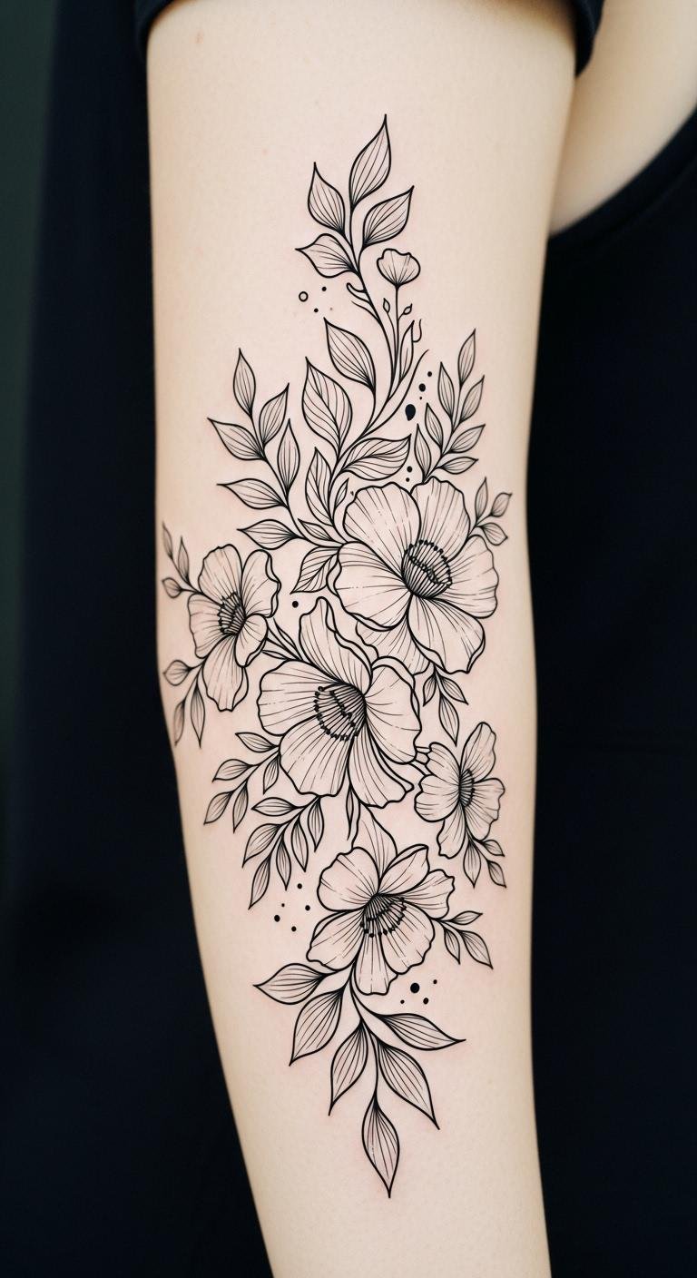 This concept pairs slender, winding stems and tiny buds rendered in crisp single-needle lines with subtle dotwork shading to emphasize petals and veins; ideal placements include the inner forearm, collarbone, or along the ribcage to follow natural contours.