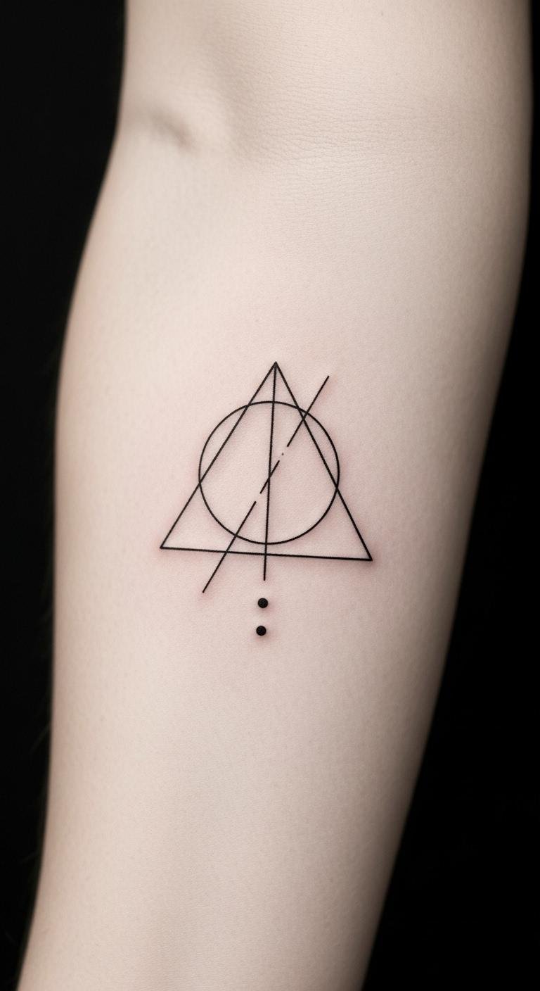 Each tattoo invites you to express your individuality, celebrating the beauty of clean lines and thoughtful design in a world overflowing with complexity. The design symbolizes balance (triangle), interrupted expectations or growth (broken parallel), aspiration or focus (concentric arc at the apex), and grounding presence (base dots); emotionally it feels calm, intentional, and quietly confident.