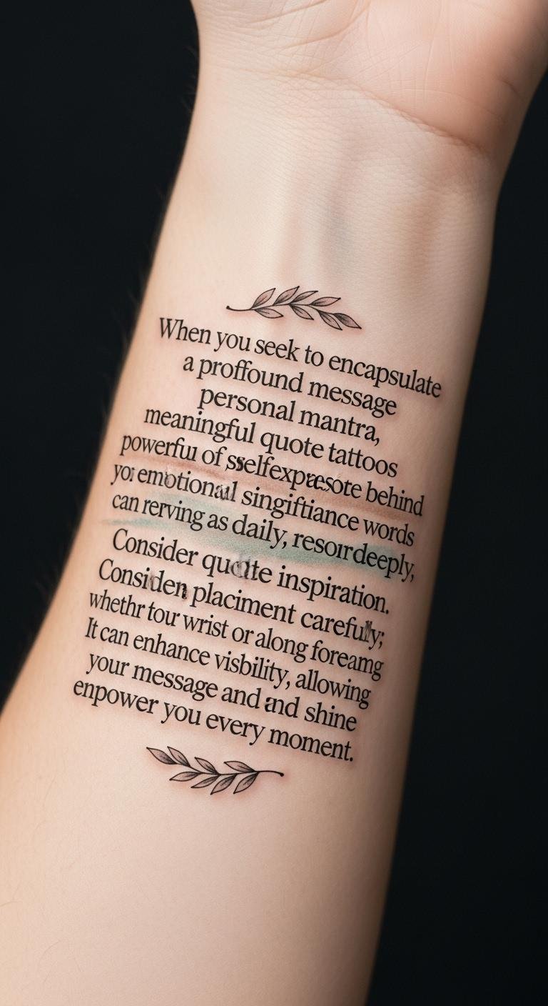 Whether it’s a favorite quote or a loved one’s name, these tattoos elegantly embody your personal journey, inviting freedom of expression in every stroke. The design emphasizes intimate emotion and personal storytelling: the flowing calligraphy evokes vulnerability and grace, the muted inks suggest memory and timelessness, and the subtle flourishes act as visual breath between words.