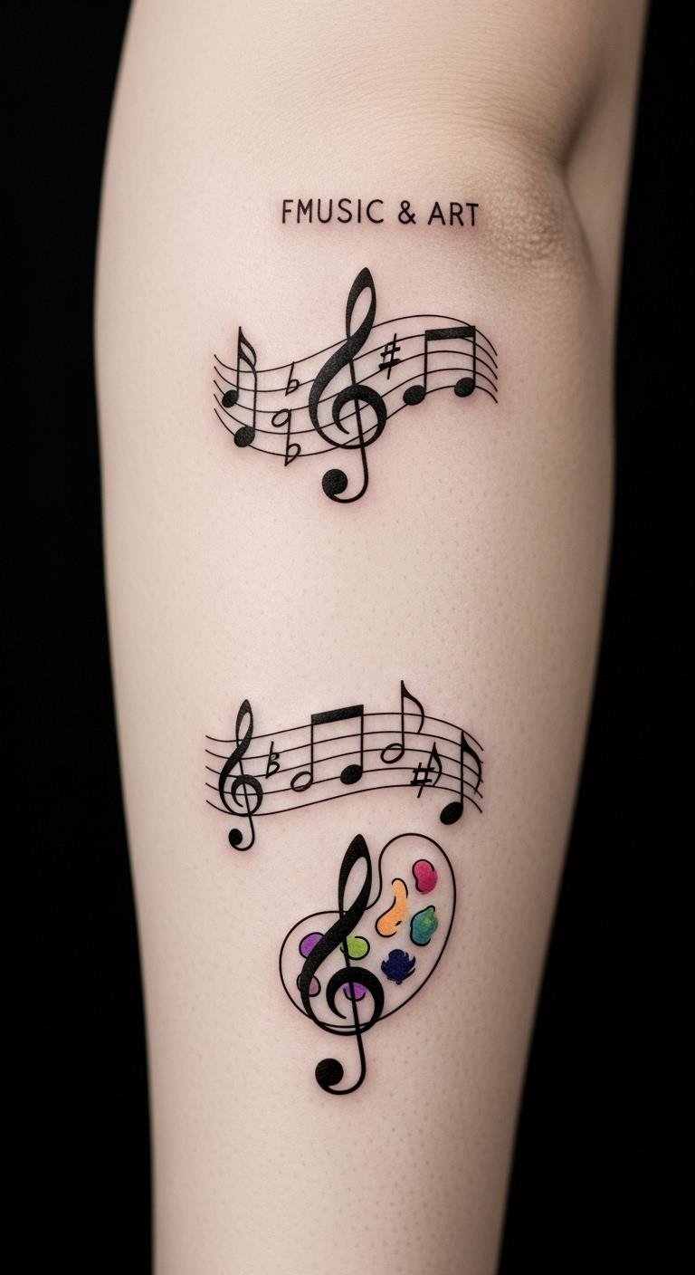 This concept blends delicate musical notation and a tiny artist’s palette in a continuous, flowing fine-line composition; the notes symbolize rhythm and memory, the palette represents color and creation, together evoking personal harmony and artistic identity. Emotionally subtle and introspective, the design reads as both celebration and quiet declaration—ideal along the forearm, behind the ear, or along the collarbone where its minimalist elegance can follow movement and appear like a private anthem shared with the world.