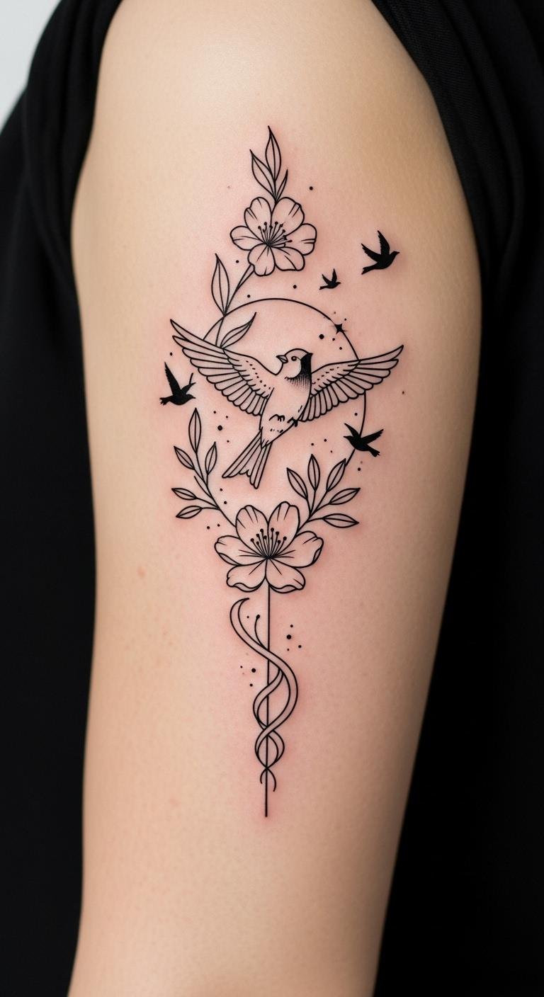 Emotionally it reads as calm confidence and thoughtful freedom, adaptable to intimate placements like the inner forearm, ribcage, or along the collarbone where curvature complements the flow, and scaled to preserve fine detail while allowing negative space to breathe.