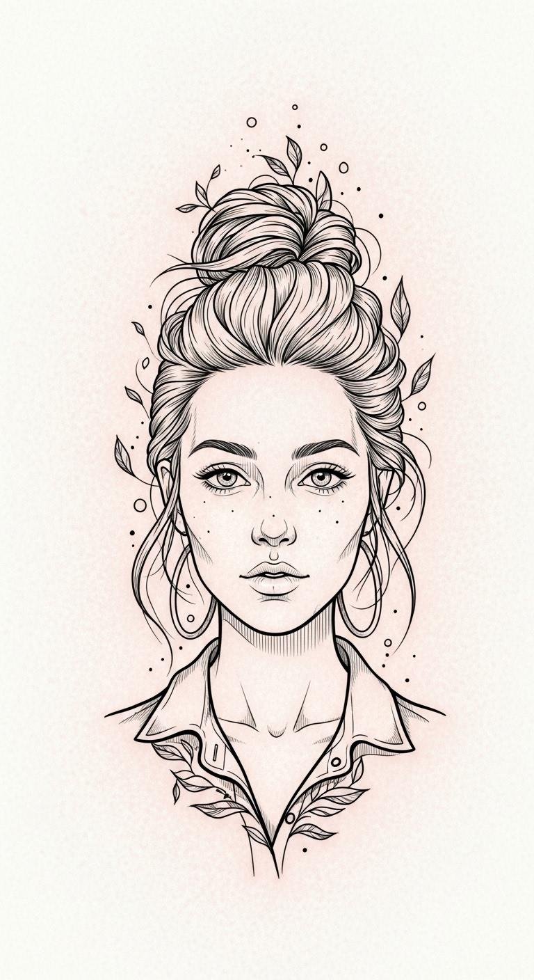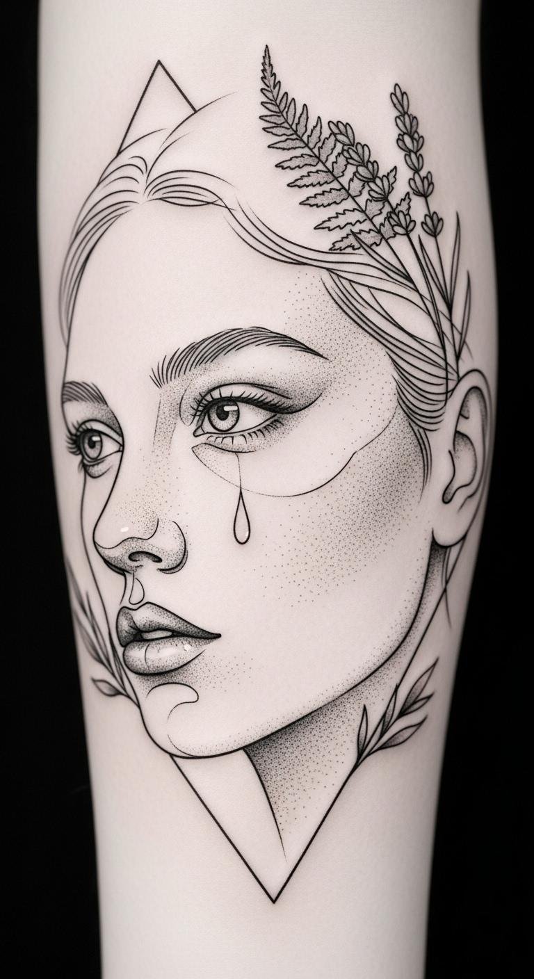 This design pairs the intimate realism of a delicate portrait with botanical elements and a restrained geometric frame to symbolize growth, resilience, and contained inner depth; the tear-shaped highlight emphasizes vulnerability and catharsis, while the fern and lavender nod to renewal and calm.