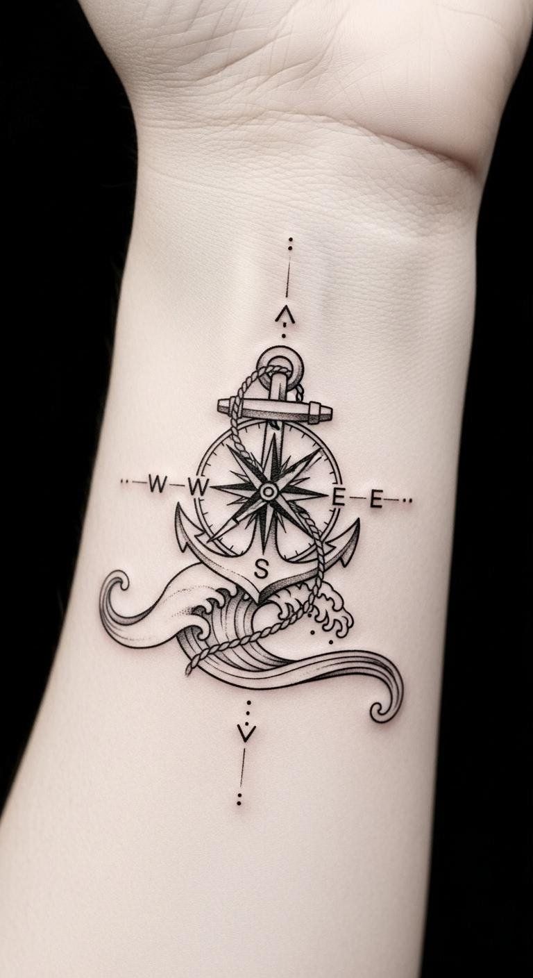 This design symbolizes stability (anchor), direction (compass), and constant motion (wave), conveying calm confidence and longing for travel; ideal placement is wrist, ankle, or behind the ear for a personal, intimate reminder.