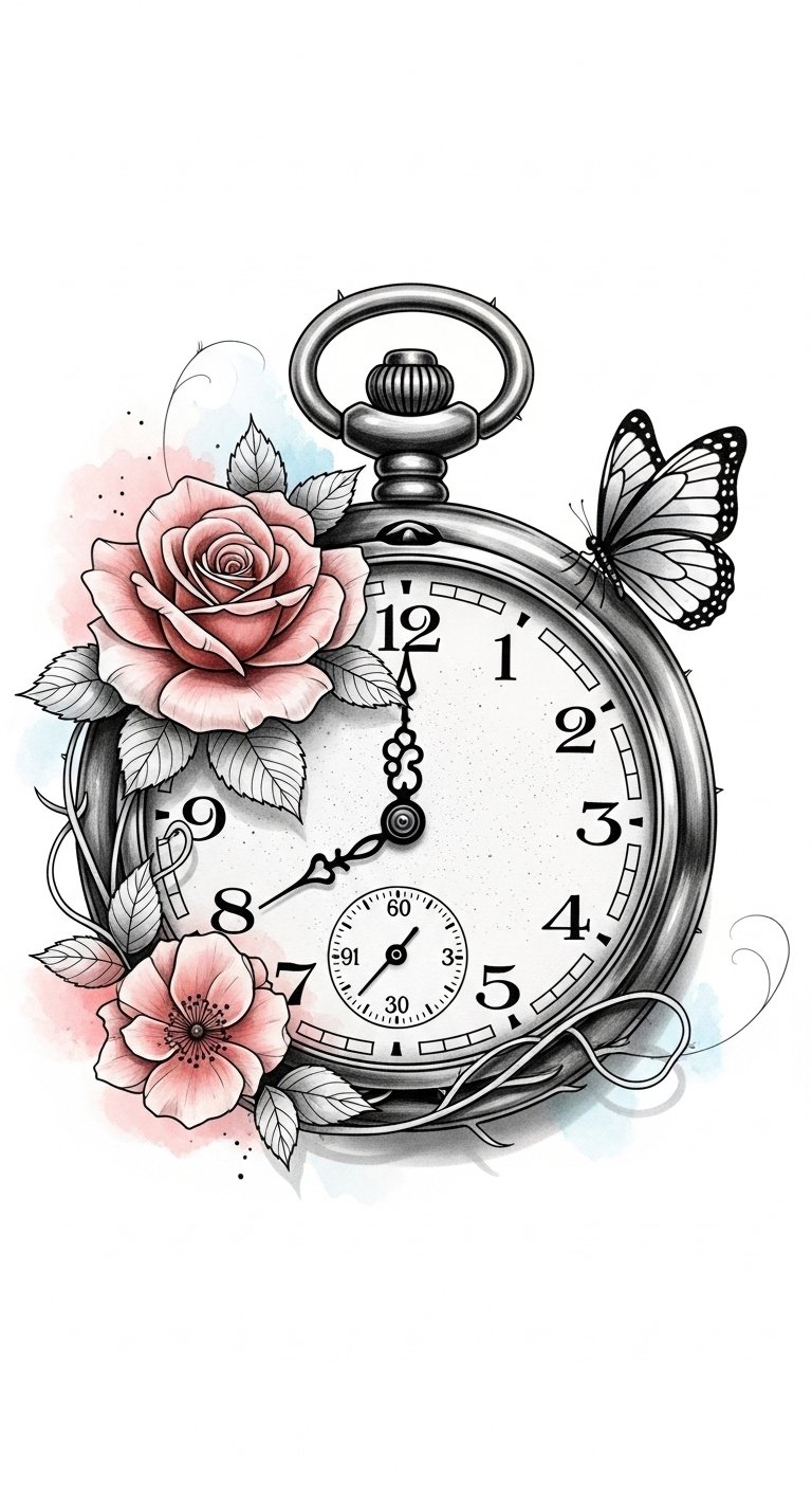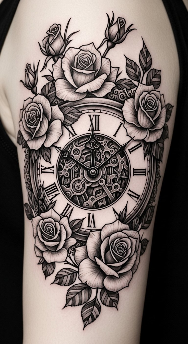 As you imagine the perfect tattoo, consider a vintage clock entwined with blooming roses, where time and beauty intertwine seamlessly.
