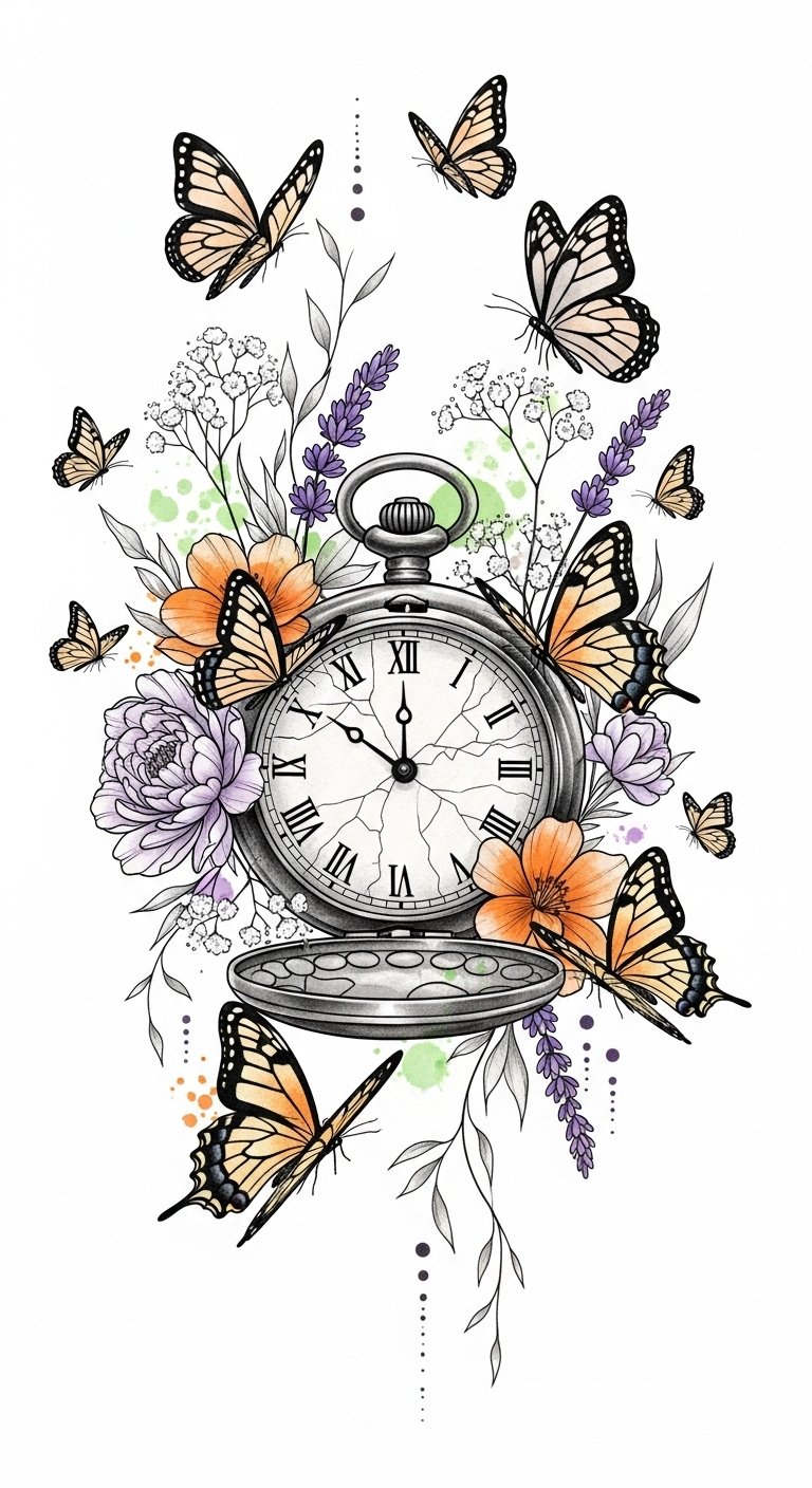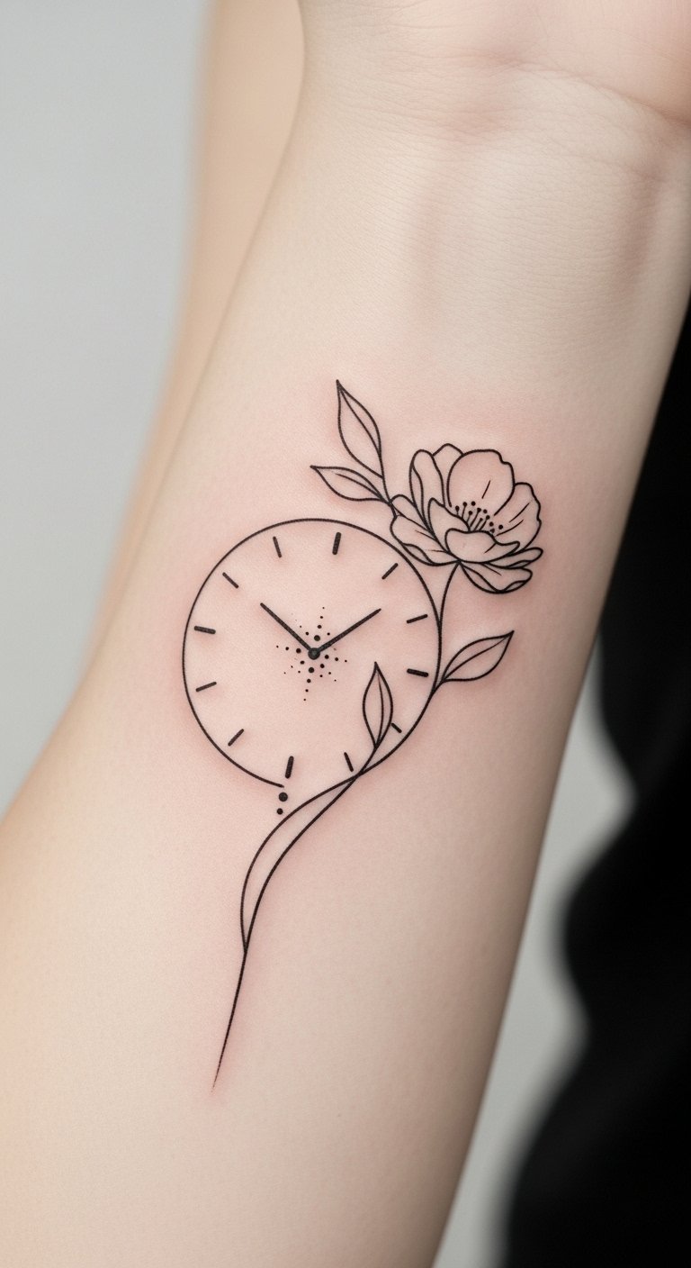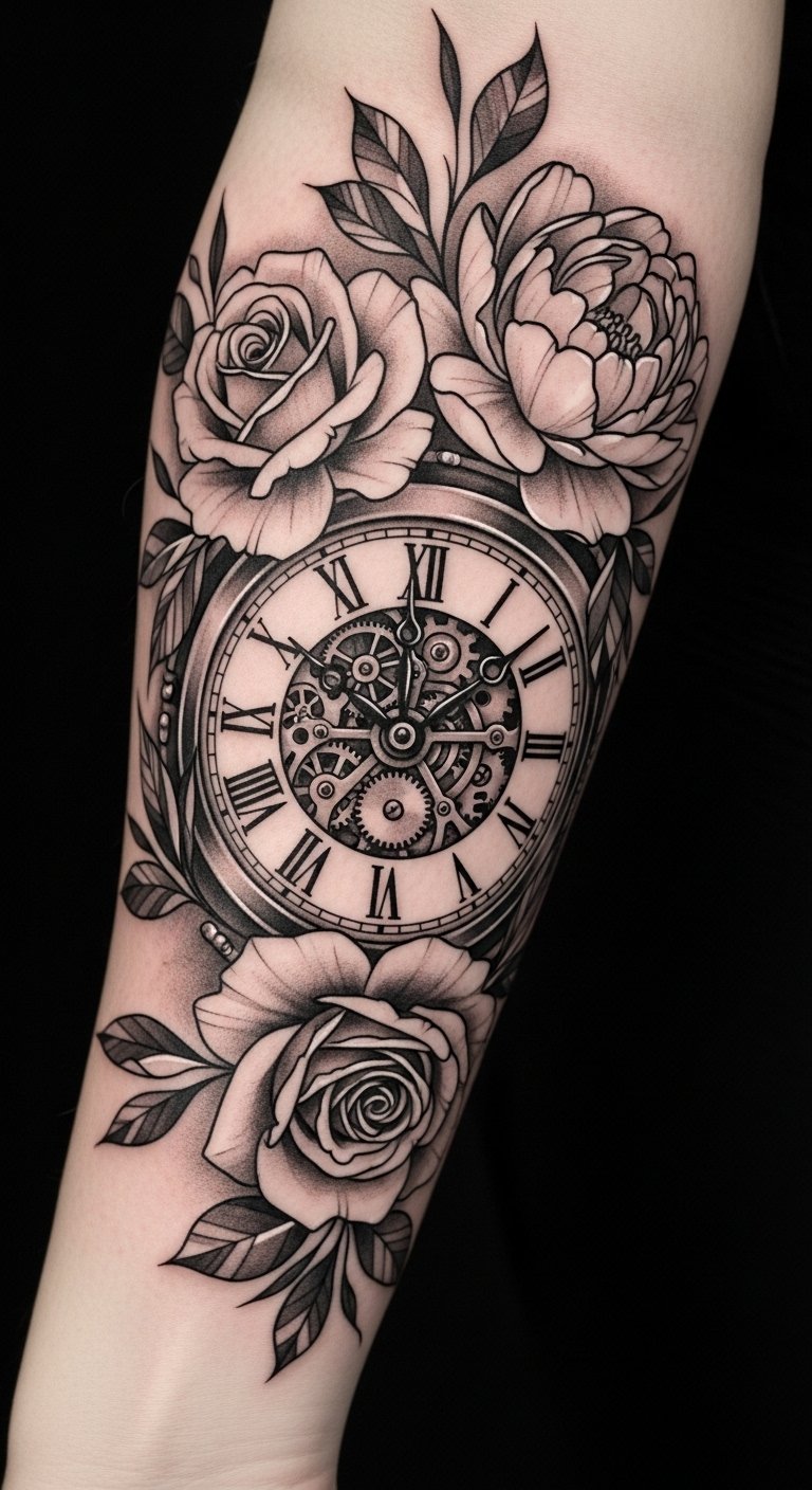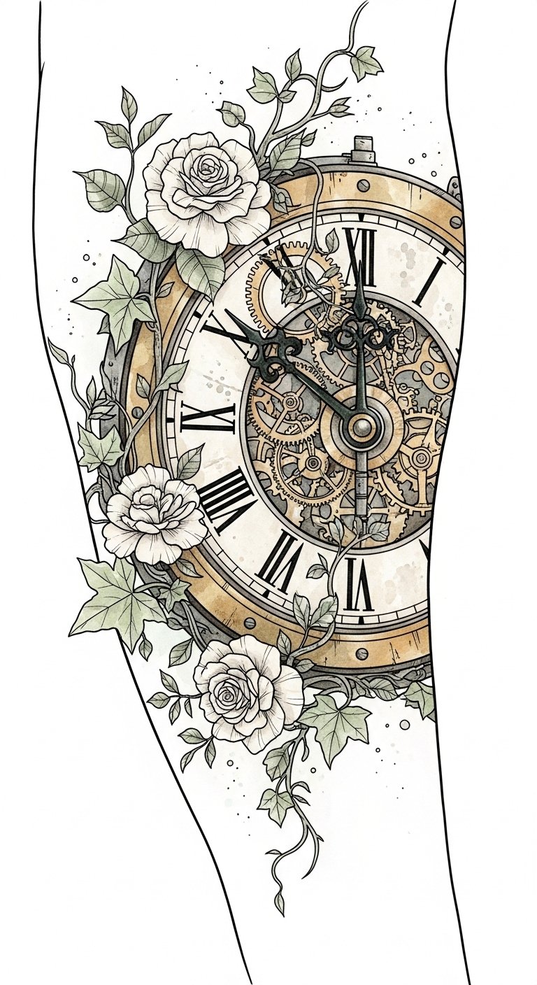 Place it along the forearm or shoulder where the circular clock can flow with the body’s contours; the imagery evokes nostalgia and quiet resilience, marrying mechanical precision with organic growth to represent transformation, remembrance, and mindful presence.
