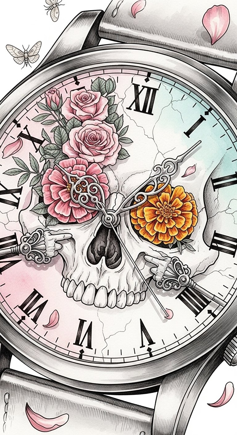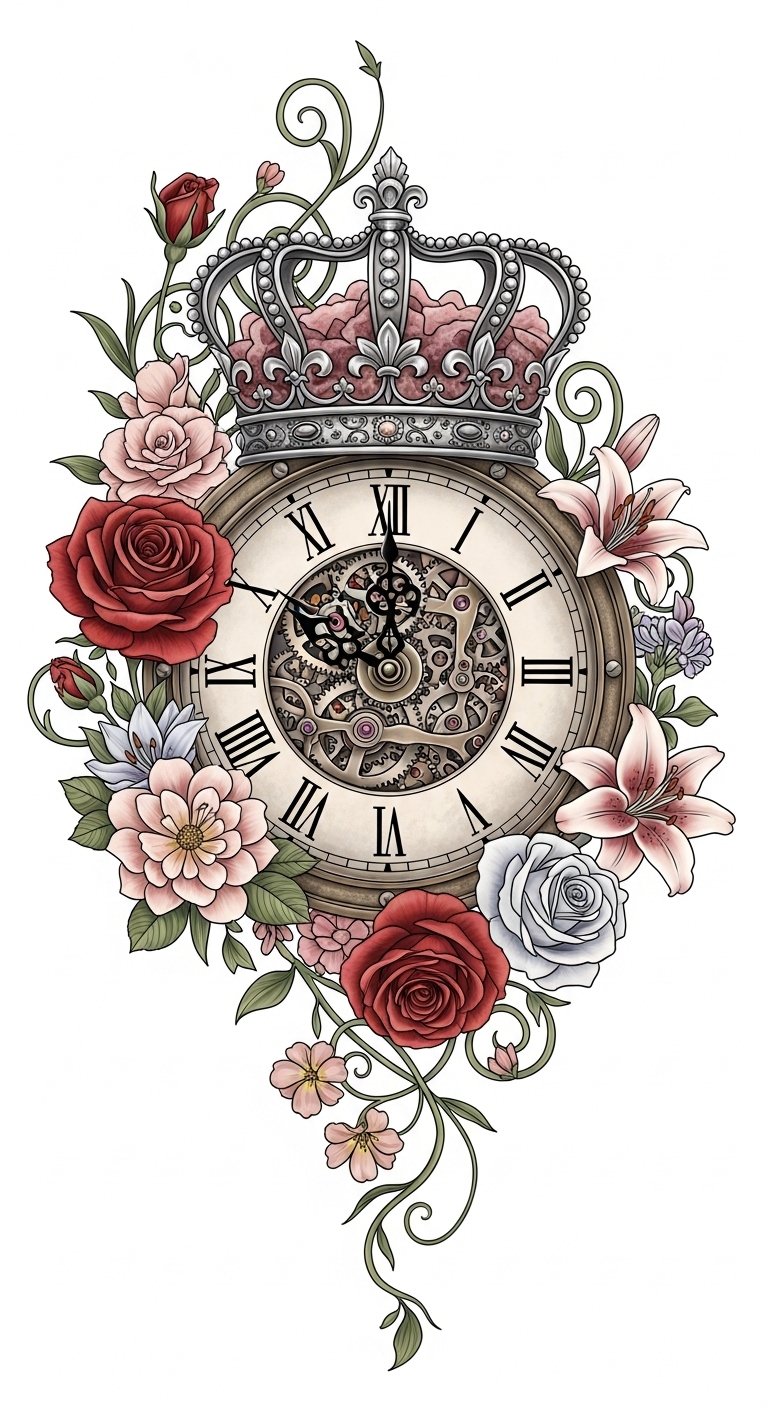 This design blends regal authority and the transience of life: the crown denotes sovereignty over one’s choices, the clock marks pivotal moments and the passage of time, and the flowers soften the composition with reminders of renewal and ephemerality.