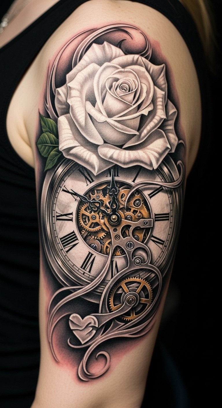 Imagine this design inked with photorealistic shading for the clock face and soft, translucent whites for the rose petals; the clock’s hands can be set to a meaningful time, with subtle crackling or moss for an aged effect, and the rose may partially overlay the clock to suggest protection and interdependence.