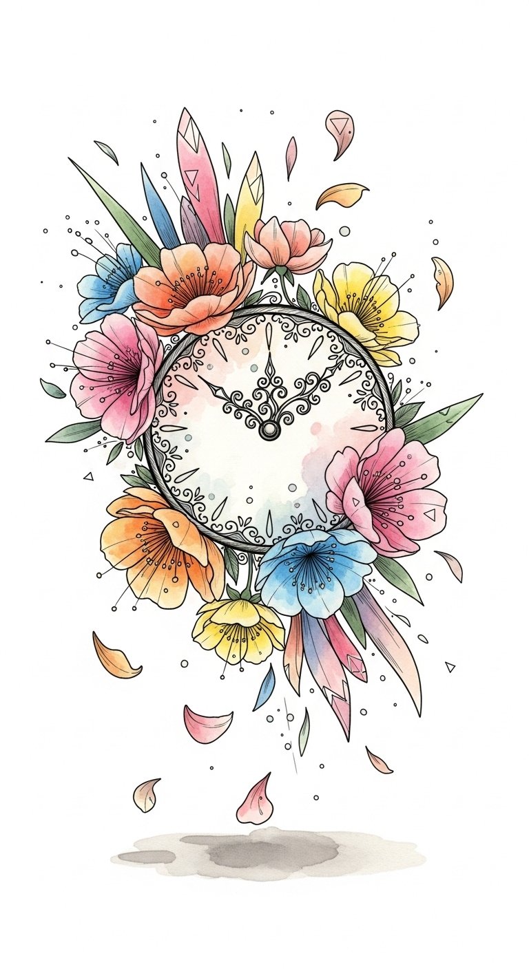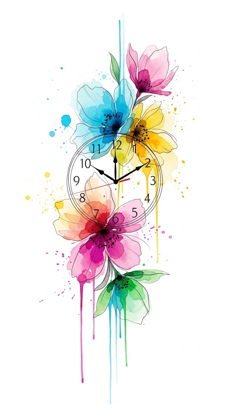 Each stroke of color and delicate petal whispers your unique story, reminding you that beauty and time intertwine in a magnificent, ever-changing tapestry. The design symbolizes the fluidity of time and personal growth—clock hands anchored yet surrounded by blooms that suggest renewal and spontaneity; emotionally it evokes joy, liberation, and remembrance.